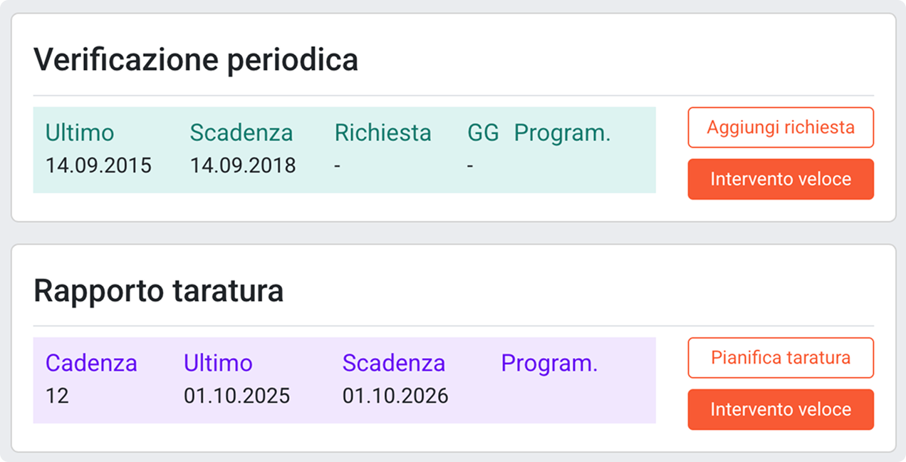 Il sistema consente la gestione delle richieste di verificazione periodica e della programmazione degli interventi, per avere un quadro sempre aggiornato delle scadenze e degli interventi pianificati presso i clienti.